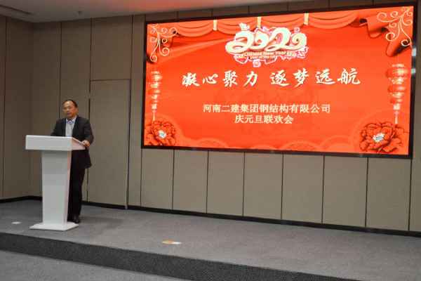 河南二建钢构总经理张永庆代表公司对全体职工一年来为企业的建设与发展付出的努力表示衷心的感谢,并致以新年的问候,同时希望在新的一年里,全体职工同心同德,齐心协力,共创佳绩。